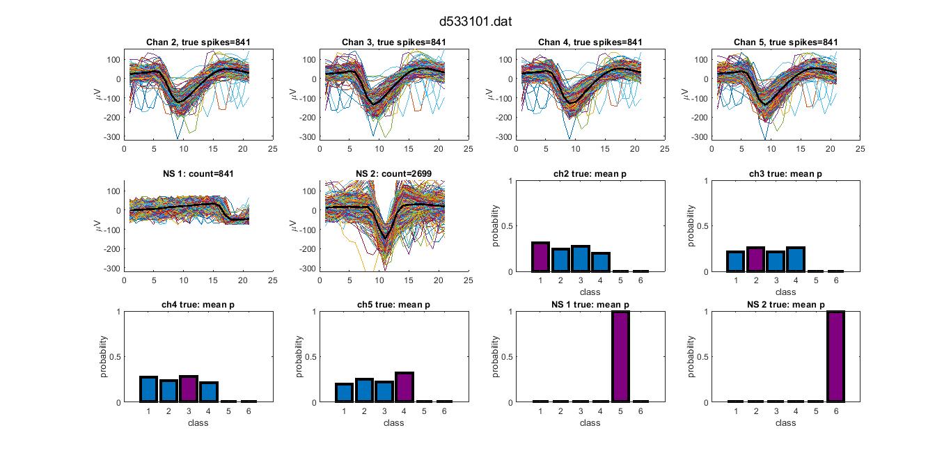 Waveform recognition of true spikes by the neural net is shown below. The first four channels are extracellular waveforms extracted per intracellular spike times (from "neuron A"). Not spikes (NS). NS 1 represents synthetic waveforms, and NS 2 represents detected spikes recorded on channel 2 that did not occur at the intracelluar spike times and, therefore, might be from one or more other neurons nearby. For this data, each waveform is 21 data points long, the neural net has one hidden layer with 30 neurons that use sigmoid activation functions, and the output layer uses a softmax function to output the probability that the waveform belongs to each of the six classifications.