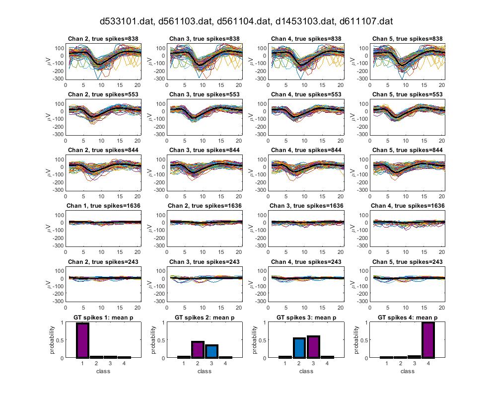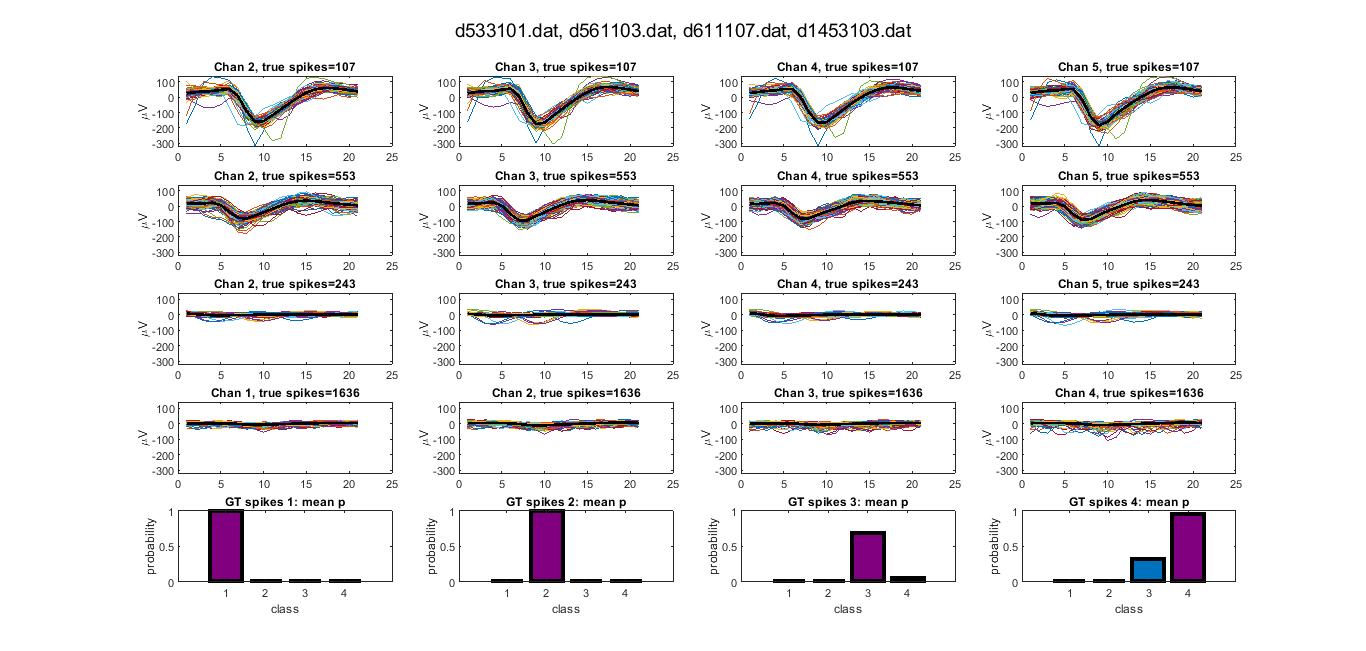 Four experiments, spike waveforms recorded on four channels per intracellular spike times (GT = ground truth).