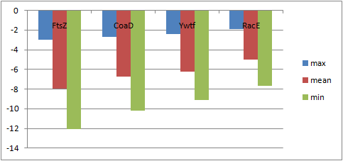 | Results: The docking scores for NPD ligands from the ZINC database bind best with FtsZ, with CoaD coming in second place. This chart shows the worst (max), the average (mean), and the best (min) binding score for each protein. These scores are in kcal/mol and, as odd as this may sound, the more negative the better. Based on the work completed so far, Demuris Ltd. has purchased the NPD chemical compounds with the greatest probability of success for in vitro testing. In theory at least, our research has provided a rational and principled basis for prioritizing relatively expensive wet lab experiments at virtually no cost per chemical compound (ligand) considered. |